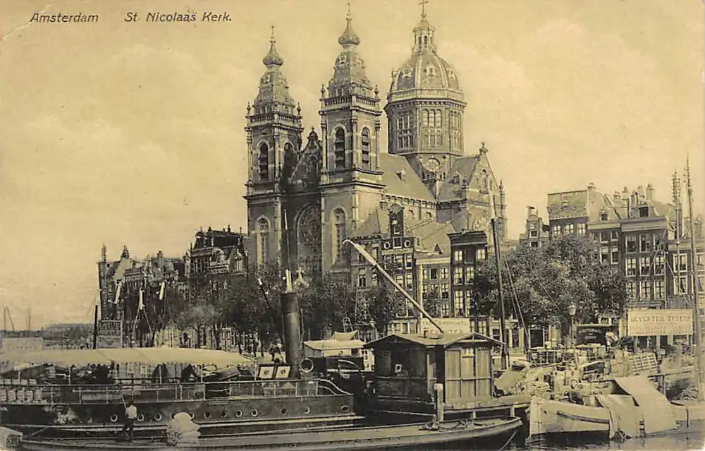 Amsterdam St. Nicolaas Kerk met binnenvaart schepen Scheepvaart 1911 HC51740 Wysoka jakość