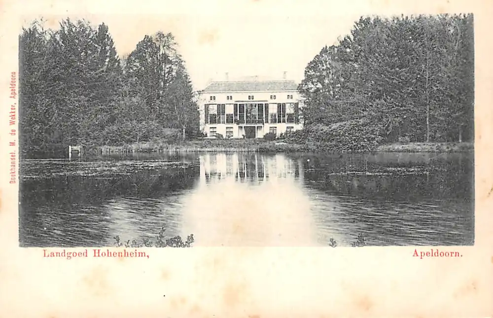 Boekhandel M. de Wekker, Apeldoorn. Ongelopen ansichtkaart uit begin 1900. Heel lichte roestplekjes.
