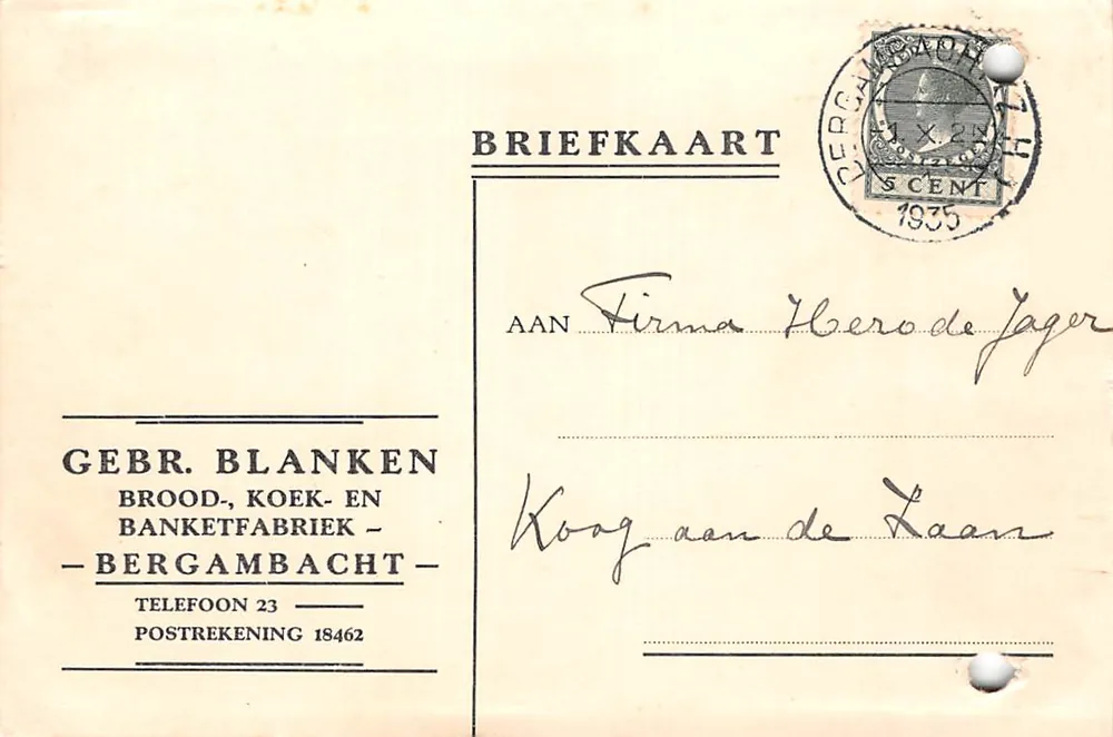 Er wordt beleefd verzocht de lijm nog niet te sturen omdat ze die nog in voorraad hebben. Verder wordt erop gewezen dat zij de lijm altijd op aanvraag willen ontvangen.\\r\\n\\r\\nGelopen briefkaart met postzegel en stempel 1935. Formaat 9,8 x 14,6 cm.