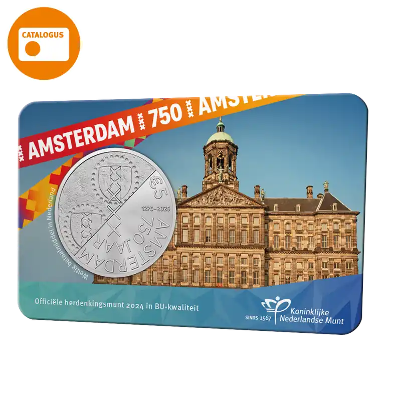 Onze hoofdstad viert feest! Vanaf 27 oktober 2024 tot en met 27 oktober 2025 viert Amsterdam haar verjaardag. En dat begint meteen groots, met de uitgifte van een speciale herdenkingsmunt. Slechts twee keer per jaar brengt de Koninklijke Nederlandse Munt, in opdracht van het Ministerie van Financiën, een herdenkingsmunt uit.Het 750 jaar Amsterdam Vijfje 2024 in BU-kwaliteit is een munt van zeer hoge kwaliteit. BU staat voor Brilliant Uncirculated. Alle munten worden geslagen met nieuwe stempels, waardoor ze mooier glanzen dan normale munten in uw portemonnee. Het 750 jaar Amsterdam Vijfje in BU-kwaliteit is gelimiteerd verkrijgbaar: mis hem niet!Verzamel de iconen van Amsterdam: de coincards in BU-kwaliteit, UNC-kwaliteit en de Eerste Dag Uitgifte* hebben elk de afbeelding van een iconisch gebouw in Amsterdam. Breng de iconen bij elkaar en verzamel het Amsterdam Centraal Station, het Koninklijk Paleis Amsterdam en de Sint Nicolaaskerk.750 jaar Amsterdam: van rustig dorp tot bruisende wereldstadDe eerste keer dat we de naam Amsterdam, in de uitvoering Amestelledamme, tegenkomen in de geschiedenis, is op 27 oktober 1275. Het is dan nog een klein dorp aan de Amstel, maar wel met een gunstige ligging voor handel. In 1275 krijgt Amsterdam officieel het tolprivilege: dit moment wordt dan ook gezien als de geboortedatum van de stad. Vanaf 1300, wanneer Amsterdam officieel stadsrechten krijgt, begint de stad echt te groeien. Onder andere de bezetting van Antwerpen door de Spanjaarden in de 16e eeuw en de industrialisatie zorgen ervoor dat Amsterdam uitgroeit tot de wereldstad die het vandaag is. Het jubileumjaar Amsterdam 750 wordt in 2024 en 2025 groots gevierd met tal van evenementen en initiatieven in en rondom Amsterdam. Verleden, toekomst en verbinding zijn de drie belangrijkste pijlers van het jubileum. Met de herdenkingsmunt onderstrepen we deze pijlers en is er voor altijd een schitterend aandenken aan 750 jaar Amsterdam.OntwerpHet 750 jaar Amsterdam Vijfje 2024 in BU-kwaliteit is ontworpen door kunstenaar Hans Gremmen. De wisselwerking tussen toen en nu is goed zichtbaar, zowel op de voor- als de keerzijde van de munt. Op de voorzijde staat het portret van Koning Willem-Alexander. Hij is zo getekend door de kunstenaar dat zijn portret dezelfde stijl krijgt als die van voorgaande Nederlandse vorsten.De keerzijde van de munt bestaat uit twee helften. Op de ene helft staat een afbeelding van een oude merkentang uit 1350 met daarop het Amsterdamse stadswapen. Dit is naar verluid de eerste keer dat het stadswapen werd gebruikt. Deze helft van de munt heeft een matte afwerking. De andere helft bestaat uit hedendaagse typografie, waarmee de tekst ‘750 jaar Amsterdam’ en de jaartallen 1275 – 2025 zijn geschreven. Deze helft heeft een meer glanzende afwerking. Beide helften komen samen door de plaatsing van drie kruizen uit het Amsterdamse stadswapen in het midden van de keerzijde.De munt steekt in een coincard waar het iconische Koninklijk Paleis Amsterdam is afgebeeld op de voorzijde. Op de achterkant is een gedeelte van de officiële Amsterdam 750 slinger zichtbaar. Verzamel alle echte Amsterdamse iconen!*De Eerste Dag Uitgifte van het 750 jaar Amsterdam Vijfje is alleen verkrijgbaar op zondag 27 oktober van 09.00 uur tot 23.59 uur. Daarna is deze gegarandeerd uitverkocht en niet meer verkrijgbaar.