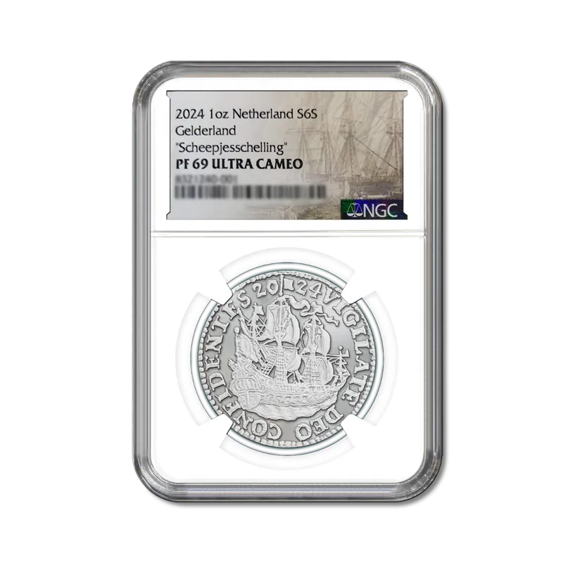 Een zilveren munt van de allerhoogste kwaliteit in uw bezit? Een aantal Scheepjesschellingen 2024 Zilver 1 ounce zijn nu verkrijgbaar als PF69 geclassificeerd in speciale capsule. De Scheepjesschelling 2024 Zilver 1 ounce is door de onafhankelijke partij NGC (Numismatic Guaranty Company) beoordeeld. 3 stuks hebben de op één na hoogste classificatie gekregen: PF69 Ultra Cameo. PF69 betekent dat de munt vrijwel geen imperfecties heeft na productie. Ultra Cameo betekent dat de munt aan beide zijden een krachtig contrast heeft. Dankzij deze beoordeling heeft u gegarandeerd een perfect geslagen zilveren herslag van de Scheepjesschelling in huis. Scan de QR-code op de capsule voor het officiële NGC certificaat met alle belangrijke informatie. Meer over de totale oplage en meer specificaties van de Scheepjesschelling 2024 Zilver 1 ounce vindt u hier.Scheepjesschelling 2024 ZilverDe Scheepjesschelling is een Nederlandse schelling die werd gemunt om de status van de Republiek te benadrukken. Vooral in de handel in de Oost was deze schelling populair en kreeg daarom de naam Scheepjesschelling. Ieder jaar slaat de Koninklijke Nederlandse Munt populaire handelsmunten, waaronder ook de Scheepjesschelling. In 2024 herslaan we de Scheepjesschelling uit Gelderland, welke in 1706 is geslagen.OntwerpDe voorzijde van de Scheepjesschelling Zilver 1 ounce uit Gelderland toont een oorlogsschip. Rondom het schip staat de tekst ‘VIGILATE.DEO.CONFIDENTES’, deze spreuk betekent ‘Vertrouwende op God’. De keerzijde van de zilveren munt toont het provinciewapen van Gelderland en het omschrift ‘MO.ARG.ORD:DVC.GELETCZ’. Dit betekent Nieuwe munt van het hertogdom Gelderland en Graafschap Zutphen.