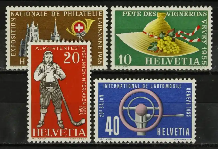 Zwitserland 1955, Michel 607-610, Nat. postzegeltentoonstelling Lausanne (I) / klederdrachten / hoornblazer / autotentoonstelling, complete serie, postfris / MNH