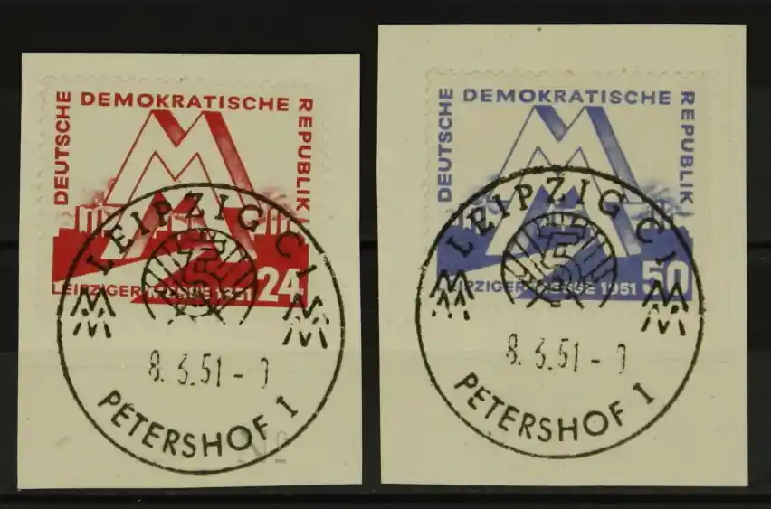 DDR 1951, Michel 283-284, Voorjaarsbeurs Leipzig, complete gestempelde set op briefstukjes / used