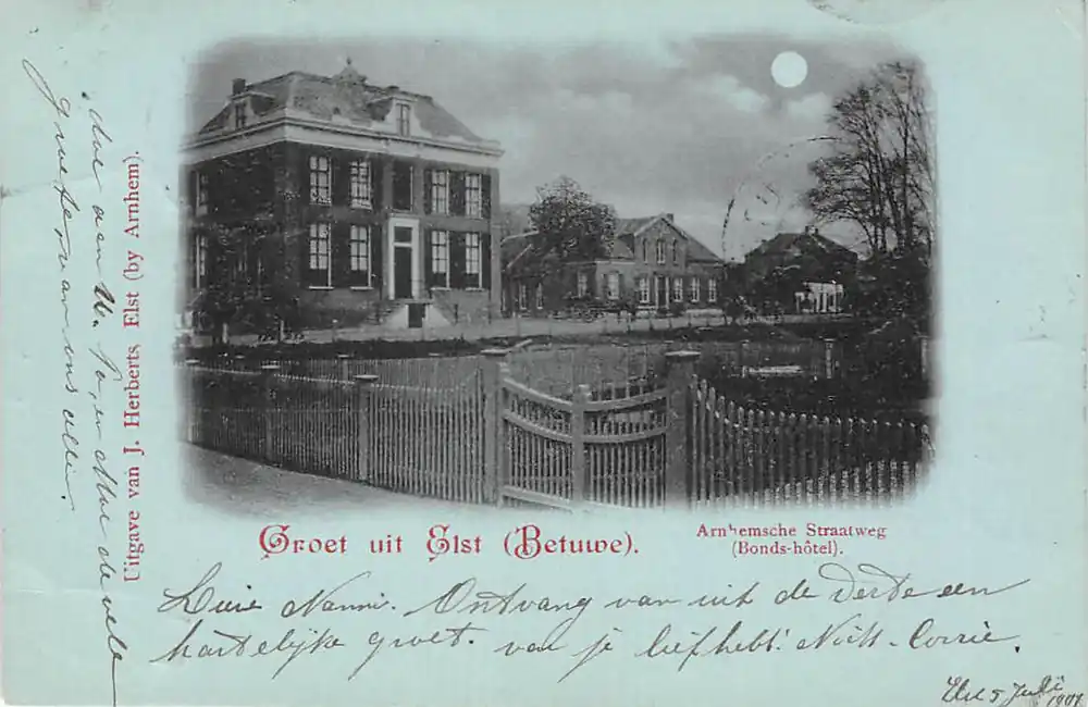 Uitgave van J. Herberts, Elst (by Arnhem). Gelopen ansichtkaart met postzegel en stempels 1900. Linkerrand enkele knikjes en miniem knikje rechter bovenhoekje.