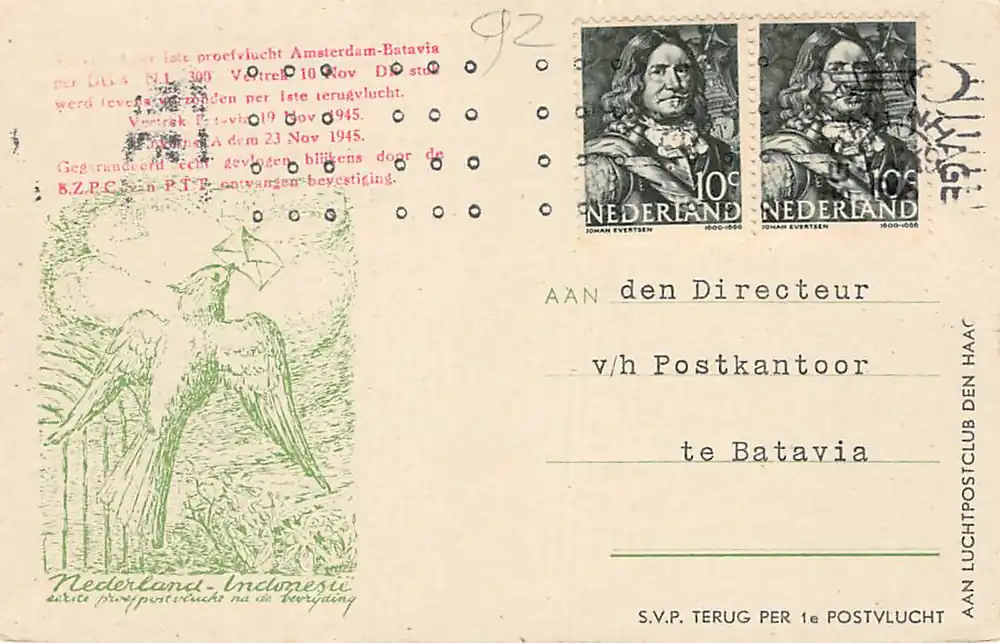 Gegarandeerd echt gevlogen blijkens door de B.Z.P.C. van P.T.T. ontvangen bevestiging. Nederland – Indonesië. Eerste proefpostvlucht na de bevrijding. Op achterkant stempeltje Ballon- en Zeppelinpostclub Secr. Schuytstr. 107, Den Haag.