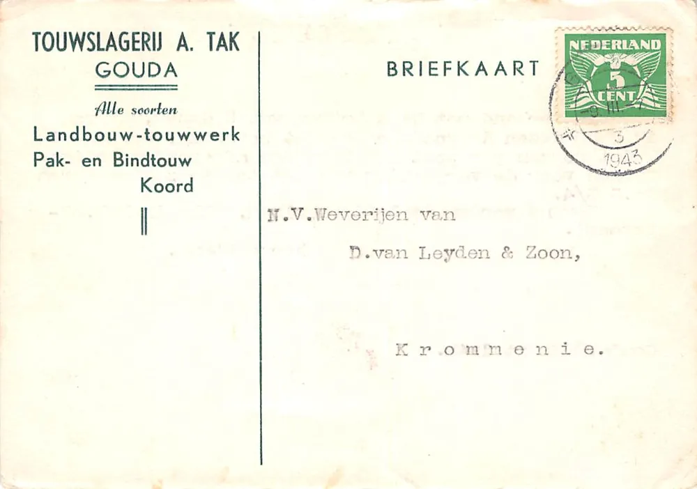 Gelopen briefkaart met postzegel en stempel 1943. Bovenrandje iets gesleten. Formaat 10,5 x 15 cm.