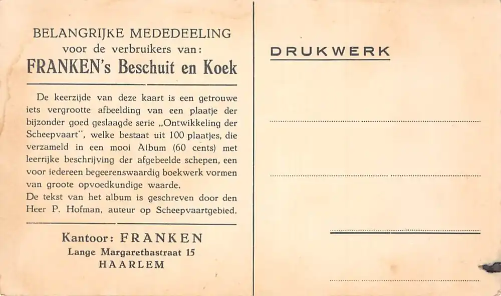 Aanbieding! Haarlem Reclame Franken Beschuit en Koek Lange Margarethastraat 15 Reclamekaart Uit de serie Ontwikkeling der Scheepvaart HC51286 Promocja€ 2,00 Oorspronkelijke prijs was: € 2,00.€ 1,00Huidige prijs is: € 1,00. Haarlem Reclame Franken Beschuit en Koek Lange Margarethastraat 15 Reclamekaart Uit de serie Ontwikkeling der Scheepvaart HC51286 Promocja aantal Toevoegen aan winkelwagen Artikelnummer: SK0089905-PL20260210-160135 Categorie: Postzegels Beschrijving Beschrijving Ongelopen ansichtkaart. Zie de scans. Gerelateerde producten Aanbieding! Boskoop Rivier de Gouwe, gezicht op de Ned. Herv. Kerk en Pastorie HC60964 Rabat € 5,00 Oorspronkelijke prijs was: € 5,00.€ 2,50Huidige prijs is: € 2,50. Toevoegen aan winkelwagen Aanbieding! Darmowa dostawa Leiden Reclame Amsterdamsche Naaimachinehandel Haarlemmerstraat 141 Original Victoria HC60899 € 4,00 Oorspronkelijke prijs was: € 4,00.€ 2,00Huidige prijs is: € 2,00. Toevoegen aan winkelwagen Aanbieding! Bezpieczna płatność Utrecht Draaiorgel van P. Winter met orgeldraaier 1965 HC60901 € 10,00 Oorspronkelijke prijs was: € 10,00.€ 5,00Huidige prijs is: € 5,00. Toevoegen aan winkelwagen Aanbieding! Amersfoort O.L.Vr. Toren en St. Joriskerk 1948 KLM Luchtfoto No. 7436 HC60955 Wysoka jakość € 3,00 Oorspronkelijke prijs was: € 3,00.€ 1,50Huidige prijs is: € 1,50. Toevoegen aan winkelwagen