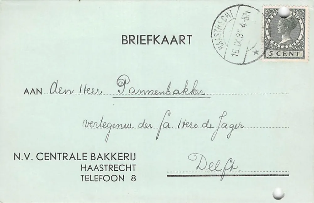 De schrijver vraagt direct 1 baal amandelen en krenten te zenden. Spoed!\\r\\n\\r\\nGelopen briefkaart met postzegel en stempel 1935. Twee ordnergaatjes rechts.
