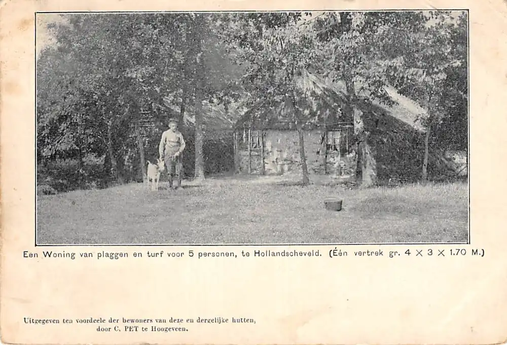Uitgegeven ten voordeele der bewoners van deze en dergelijke hutten door C. Pet te Hoogeveen. Gelopen ansichtkaart met postzegel en stempels\\u00a0 1903. Lichte albumvouwtjes in hoekjes en bovenrandje gebruikt.