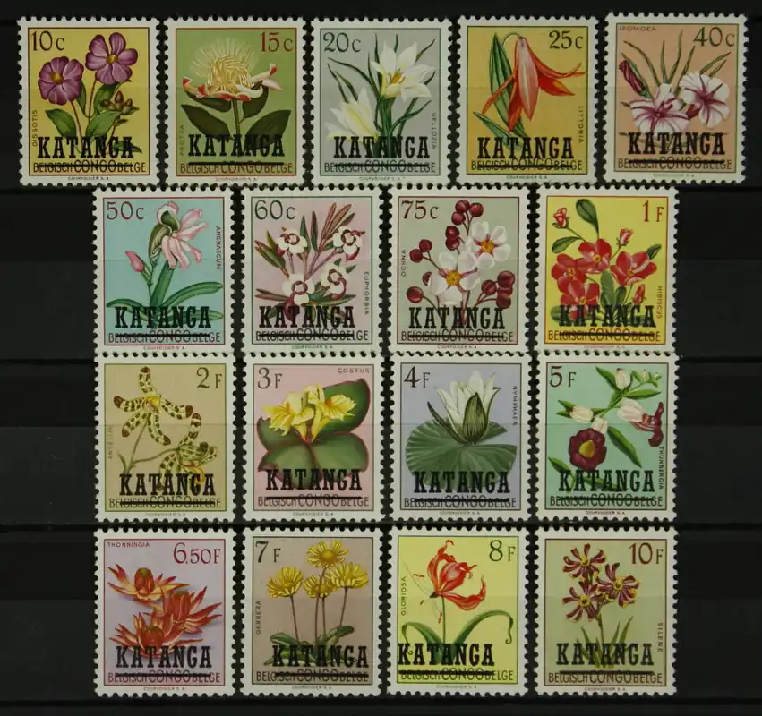 Katanga 1960, OBP-catalogus 23-39, Bloemen, complete postfrisse serie / MNHZegels van Belgisch Congo van 1952 met opdruk “Katanga”