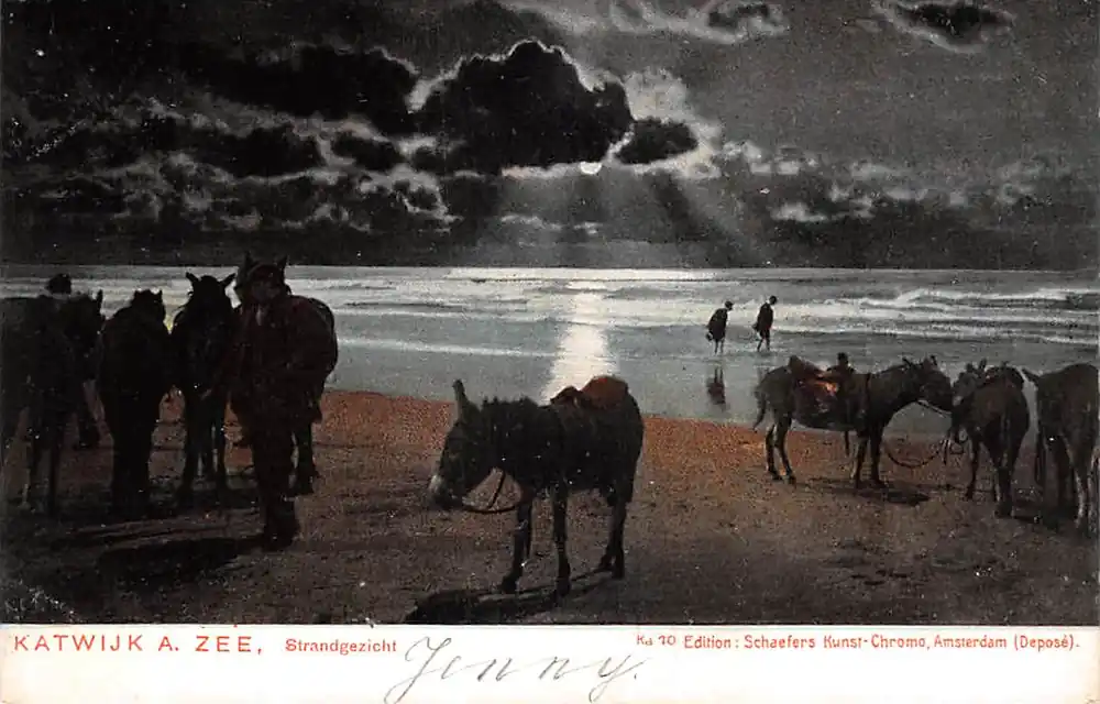 Katwijk aan Zee Strand gezicht met ezels en paarden in de avond HC51700 Zwrot pieniędzy