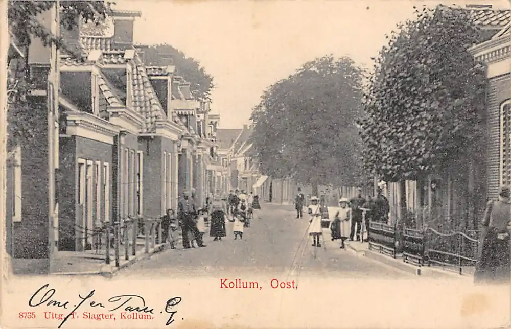 8735 Uitg. T. Slager Kollum. Met postzegel en stempel Kollum 1909. Achterop met potlood getekend.