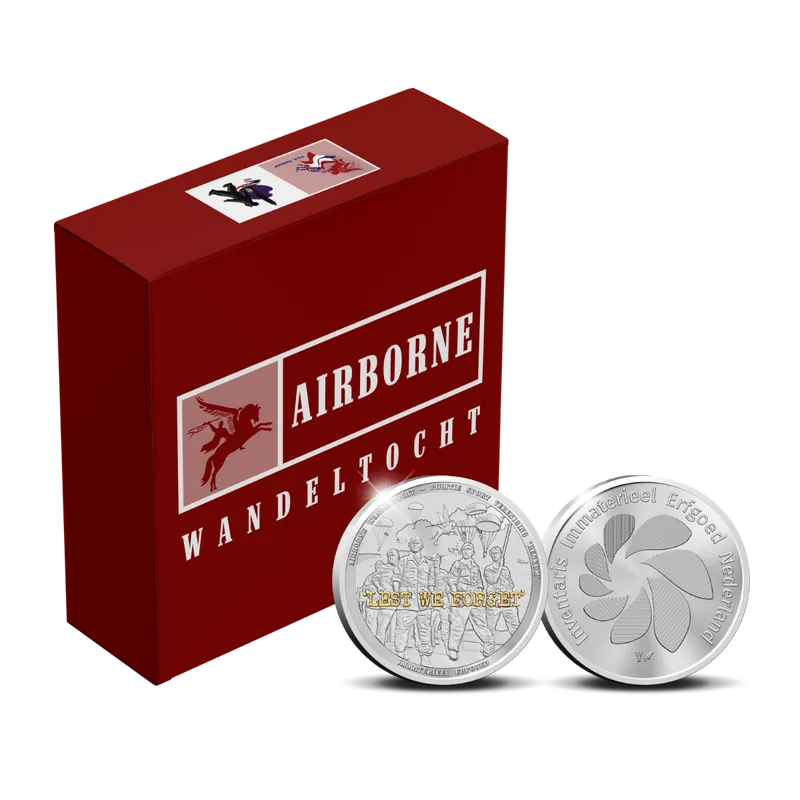Erfgoed komt in verschillende vormen. Waar we in 2023 en 2022 een feestelijke uitgifte hadden (respectievelijk 10 jaar Koningsdag en Zomercarnaval Rotterdam), lanceren we nu een mooie uitgifte met een belangrijke boodschap die niet vergeten mag worden. De Koninklijke Nederlandse Munt lanceert een exclusieve uitgifte voor de Airborne Wandeltocht, in Zilver 1 ounce met bijzonder kleurdetail. Met de uitgifte herdenken we geallieerde militairen en hun opofferingen tijdens de Slag om Arnhem in september 1944. De Airborne Wandeltocht Zilver 1 ounce met kleur is onderdeel van de serie ‘Immaterieel Erfgoed in Nederland’.Airborne WandeltochtVan 17 tot 25 september 1944 werd er hard gevochten in en rond de stad Arnhem. De luchtlanding en veldslag waren onderdeel van Operatie Market Garden. Ruim 5.000 man landden in de middag van 17 september per parachute en zweefvliegtuig bij Wolfheze en ten noorden van Heelsum. Een dag later landden 1.900 parachutisten op de Ginkelse heide bij Ede en zweefvliegtuigen met personeel en materiaal in de omgeving van Renkum en Wolfheze. Na zware gevechten slaagden de geallieerden er niet in om de brug in Arnhem over de Rijn in bezit te houden, waardoor in de nacht van 25 op 26 september zo’n 2.400 soldaten veilig gebied wisten te bereiken, na oversteek van de Rijn bij Oosterbeek. Bijna 6.500 militairen werden krijgsgevangen genomen en pas bevrijd in april of mei 1945.Om de opofferingen van de geallieerde militairen niet te vergeten, organiseert Politie Sportvereniging Renkum in 1947 voor het eerst de Airbornemars, een herdenkingsmars om degenen te eren die in 1944 hebben gestreden voor de bevrijding van ons land. Aan de eerste mars namen zo’n 2.000 wandelaars deel. Inmiddels doen duizenden wandelaars mee aan de Airborne Wandeltocht. Deelnemers kunnen kiezen uit vier routes: 10, 15, 25 en 40 kilometer. De routes komen langs belangrijke plekken uit die ene week in september 1944. Leden van de Politie Sportvereniging Renkum en honderden vrijwilligers zetten zich jaarlijks in om een geweldige wandeldag te organiseren.OntwerpDe Airborne Wandeltocht uitgifte in Zilver 1 ounce staat in het teken van de geallieerde militairen. Daarom staat op de voorzijde van de penning een groep militairen, met op de achtergrond parachutes die naar beneden komen. In het midden staat de tekst ‘Lest we forget’. Op deze letters is een gouden kleur aangebracht om deze belangrijke woorden extra kracht bij te zetten. Op de keerzijde van de uitgifte staat het logo van de Inventaris Immaterieel Erfgoed. Zoals u van ons gewend bent vindt u hier ook de specificaties van de penning.
