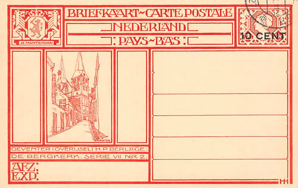 H.P. Berlage Serie VII Nr. 2. Afbeelding op briefkaart met 10 cents opdruk op 12,5 cent en met dagstempel 13 – X – 11 1927. Kleinformaat.