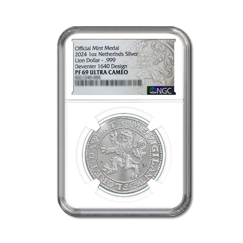 Een zilveren munt van de allerhoogste kwaliteit in uw bezit? Een aantal Leeuwendaalders 2024 Zilver 1 ouncezijn nu verkrijgbaar als PF69 geclassificeerd in speciale capsule. De Leeuwendaalder 2024 Zilver 1 ounce is door de onafhankelijke partij NGC (Numismatic Guaranty Company) beoordeeld. 10 stuks hebben de op één na hoogste classificatie gekregen: PF69 Ultra Cameo. PF69 betekent dat de munt vrijwel geen imperfecties heeft na productie. Ultra Cameo betekent dat de munt aan beide zijden een krachtig contrast heeft. Dankzij deze beoordeling heeft u gegarandeerd een perfect geslagen zilveren herslag van de Leeuwendaalder in huis. Scan de QR-code op de capsule voor het officiële NGC certificaat met alle belangrijke informatie. Meer over de totale oplage en meer specificaties van de Leeuwendaalder Zilver 1 ounce vindt u hier.Leeuwendaalder 2024 ZilverWist u dat de Leeuwendaalder de voorloper is van de huidige Amerikaanse dollar? Hollandse kolonisten namen de munt mee naar New Amsterdam (later New York) en gebruikten deze daar volop. Het woord ‘’daalder’’ werd in het Engels vertaald naar “dollar”. De grootste valuta ter wereld kent haar oorsprong in een Nederlandse munt!De Leeuwendaalder werd in Nederland vanaf 1575 geslagen en uitgegeven door zes van de zeven Nederlandse provincies en enkele grote steden. Een van deze steden is Deventer. De Leeuwendaalder 2024 Zilver 1 Ounce is een gouden herslag van de originele munt uit Deventer, welke een bijzondere verrassing in petto heeft!OntwerpOmdat er sprake is van een stedelijke Leeuwendaalder uit Deventer, is het wapenschild van Holland dat normaal op de Leeuwendaalder staat nu vervangen voor een stadsadelaar, het boegbeeld van Deventer. Ook is er sprake van een andere tekst op de keerzijde: ‘ME VIGILANTE FLORET DAVENT.’ Dit betekent: ‘Omdat ik waak, bloeit Deventer’. De tekst maakt deze zilveren Leeuwendaalder extra uniek.