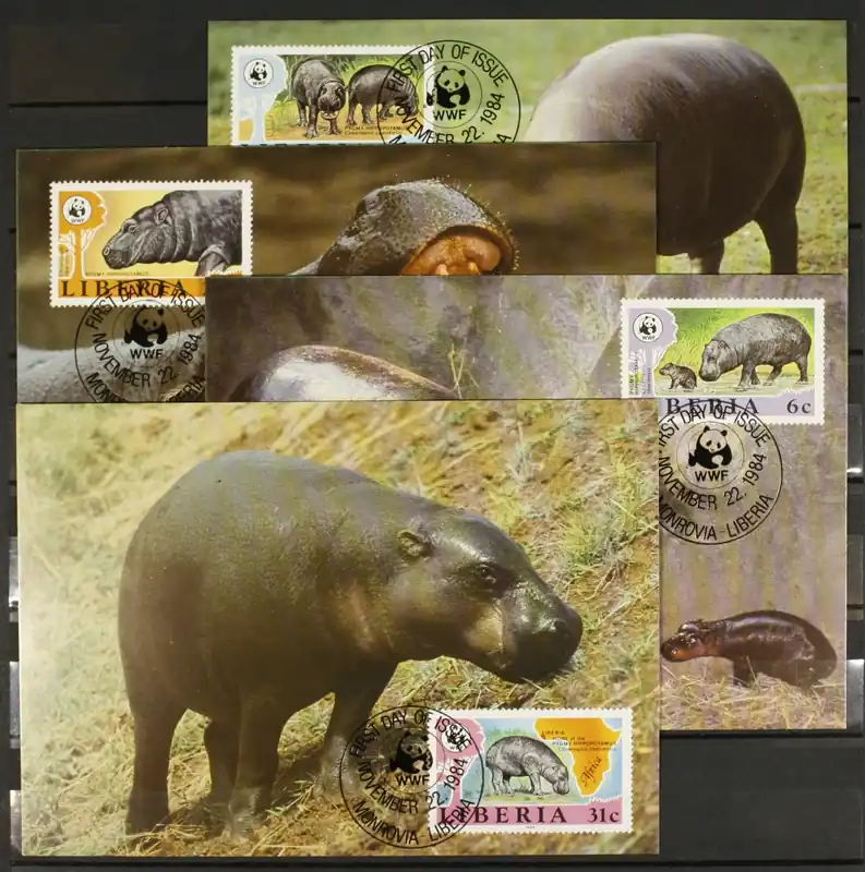 Liberia 1984, Michel 1315-1318, Natuurbescherming (WNF): Dwergnijlpaarden, complete serie op Maximumkaart