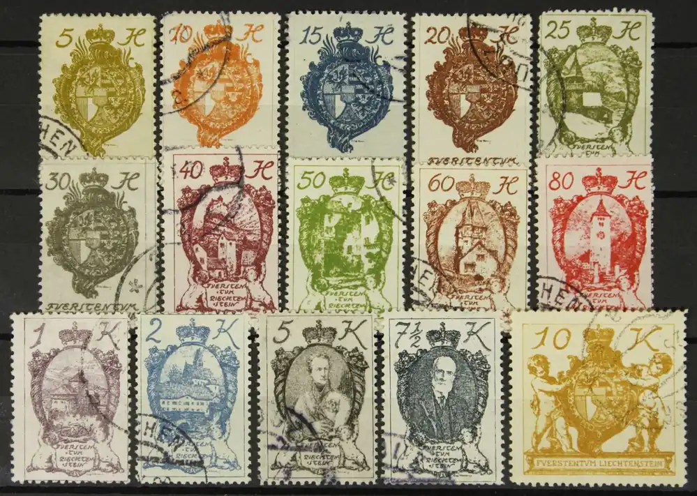 Liechtenstein 1920, Michel 25-39, Gebouwen, Persoonlijkheden en Landswapen, complete gestempelde serie