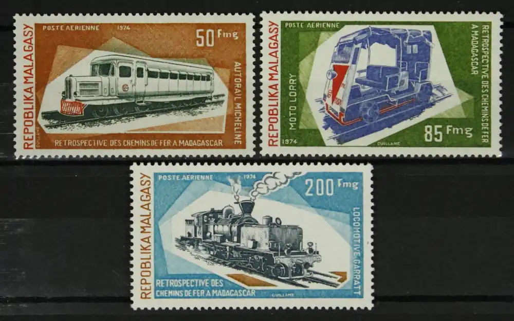 Madagaskar 1974, Michel 713-715, Geschiedenis v.d. spoorwegen op Madagaskar: Locomotieven, complete postfrisse serie / MNH