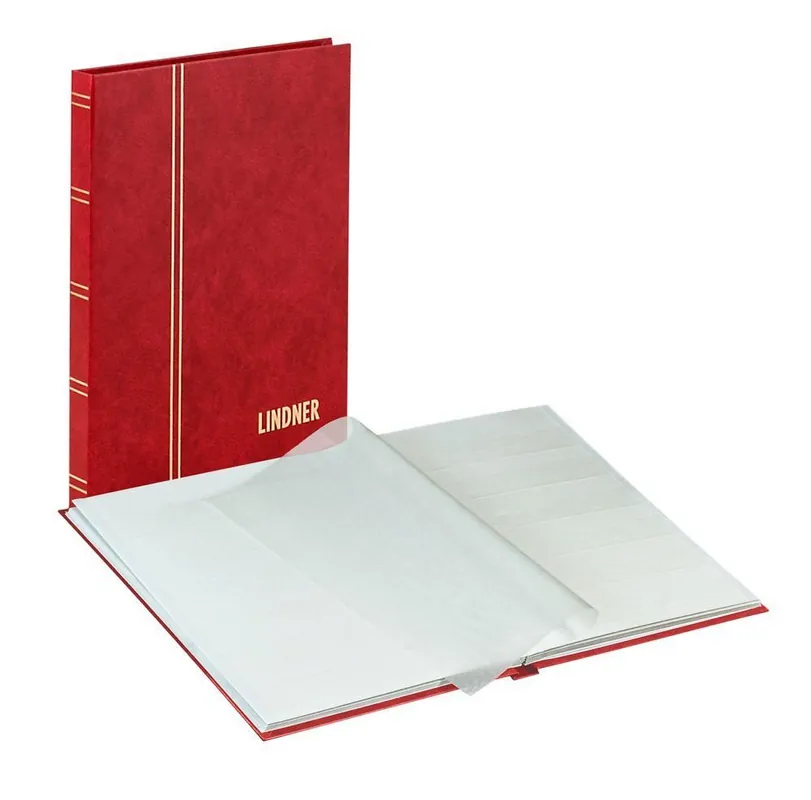 Lindner 1159 insteekboek middelformaat met witte bladzijden (kaftkleur rood)- formaat 16,5 x 22 cm- 16 witte bladen = 32 blz.- 6 doorlopende pergamijn foliestroken per bladzijde- met pergamijn tussenbladen- met lederlook kaft en goudopdruk op rug en voorzijde- Duits kwaliteitsprodukt