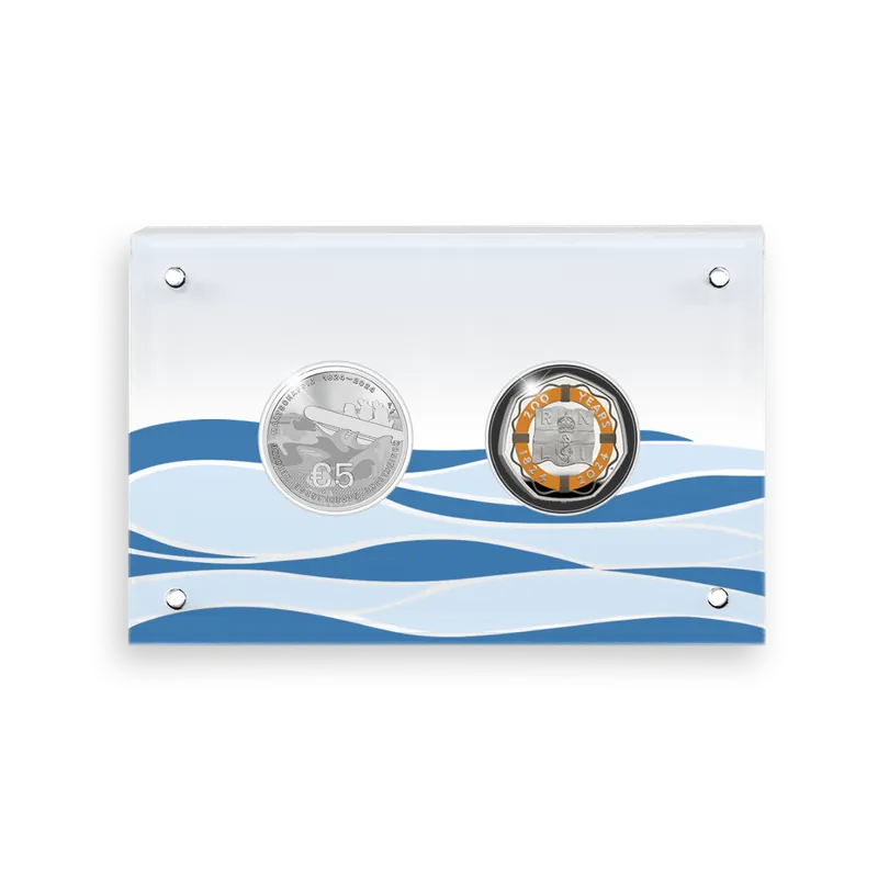 De Koninklijke Nederlandse Redding Maatschappij (KNRM) bestaat in 2024 officieel 200 jaar. Maar ook haar Engelse zusterorganisatie, de Royal National Lifeboat Institution (RNLI) viert dit bijzondere jubileum. Beide organisaties bestaan 200 jaar en dat vraagt om een unieke set. Speciaal hiervoor heeft de Koninklijke Nederlandse Munt een bijzondere Zilverset ontworpen. Van deze zeer gelimiteerde set zijn slechts 200 stuks verkrijgbaar!KNRM en RNLIZowel de KNRM als de RNLI zijn organisaties die van levensbelang zijn. Beide zorgen ze jaarlijks voor tientallen levensreddende acties op zee. De KNRM werd in 1824 als zelfstandige reddingsorganisatie opgericht, als gevolg van een reddingsactie door kustbewoners van Den Helder. De principes die 200 jaar geleden aan de basis van de KNRM stonden, gelden nu nog steeds. Hulpverlening is kosteloos, de reddingsacties worden uitgevoerd door vrijwilligers en de KNRM wordt in stand gehouden door donateurs.De RNLI werd officieel opgericht op 4 maart 1824, door Sir William Hillary. Van houten boten met roeiriemen en zeilen naar de nieuwste reddingsboten, uitgerust met de nieuwste technologie: in 200 jaar tijd is de RNLI uitgegroeid tot een moderne organisatie, gesteund door donateurs vanuit heel Groot-Brittannië. In totaal heeft de RNLI meer dan 144.000 levens gered.DesignDe Speciale Set: 200 jaar KNRM & RNLI bestaat uit twee zilveren munten: het KNRM 200 jaar Vijfje Zilver Proof en de 200 Years of the RNLI 2024 UK 50p Zilver Proof. Het portret van Koning Willem-Alexander staat afgebeeld op de voorzijde van de KNRM 200 jaar Vijfje Zilver Proof. Aan de keerzijde staat de zee onstuimig afgebeeld, terwijl een KNRM reddingboot gedragen wordt door de woeste golven. Bij beweging van de munt lijkt het alsof de zee tot leven komt. De 200 Years of the RNLI 2024 UK 50p Zilver Proof is een gekleurde munt. Op de voorzijde is het portret van Koning Charles III te zien. De keerzijde bevat het logo van de RNLI, met daar omheen een oranje reddingsboei, welke in kleur op de munt is afgebeeld.Samen zitten de zilveren munten in een bijzondere verpakking. Het lijkt of de munten in het water liggen, een mooie verwijzing naar dé plek waar de reddingen plaatsvinden: de zee. De unieke verpakking maakt deze set extra gewild!Specificaties:KNRM 200 jaar Vijfje 2024 Zilver Proof MetaalZilverGehalte925/1000KwaliteitProofGewicht15.5 gDiameter33 mmRandschrift* GOD * ZIJ * MET * ONSNom. waarde5 euroOplage3.500 (200 in deze verpakking)200 jaar RNLI 2024 UK 50p Zilver Proof met kleurMetaalZilverGehalte925/1000KwaliteitProofGewicht8 gDiameter27,3 mmNom. waarde50 penceOplage4.000 (200 in deze verpakking)The Royal Mint Limited draagt £2.66 per set af exclusief BTW ter ondersteuning van de RNLI. De betalingen worden gedaan aan RNLI (Sales) Ltd (die al haar belastbare winsten betaalt aan de RNLI, een liefdadigheidsinstelling geregistreerd in Engeland en Wales (209603), Schotland (SC037736), de Republiek Ierland (20003326), het Bailiwick of Jersey (14), het eiland Man (1308 en 006329F) en het Bailiwick of Guernsey en Alderney.