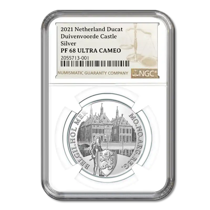 Voeg nu een Unieke zilveren dukaat toe aan uw collectie! De Zilveren Dukaat ‘Kasteel Duivenvoorde’ 2021 heeft een PF68 beoordeling gekregen. PF68 munten bieden uitstekende kwaliteit met slechts minimale sporen van oneffenheden. Deze zilveren munt is een uitstekende keuze voor verzamelaars die schoonheid en waarde zoeken. Een zeer gelimiteerd aanbod is verkrijgbaar!OntwerpOp de voorzijde van de Zilveren Dukaat ‘Kasteel Duivenvoorde’ staat ridder Godard van Reede voor het elegante Zuid-Hollandse kasteel. Op het schild voor zijn linkerbeen is het wapen van de provincie afgebeeld. Het opschrift van de uitgifte luidt: ‘MO.NO.ARG.REG.BELGII.HOL MER’. ‘MO.NO.ARG.REG.BELGII.’ is de afkorting van het Latijnse ‘Moneta Nova Argenta Regni Belgii’: Nieuwe Zilveren munt van het Koninkrijk der Nederlanden. ‘HOL MER’ staat voor de provincie Zuid-Holland.De keerzijde van de uitgifte toont het Rijkswapen met de Koninklijke Kroon tussen de cijfers van het jaartal. Het opschrift luidt ‘CONCORDIA RES PARVAE CRESCUNT’, Eendracht maakt macht.