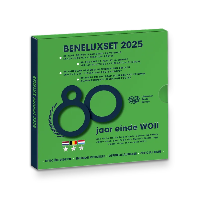 DE LIBERATION ROUTE EUROPE EN DE BENELUXDe Liberation Route Europe verbindt de belangrijkste regio’s waarlangs de Westerse Geallieerden oprukten tijdens de laatste fase van WOII. Via een indrukwekkend parcours dat 10 landen doorkruist, kunnen honderden historische locaties ontdekt worden: van oorlogsgraven, musea en monumenten tot plaatsen waar geregeld evenementen en herdenkingen plaatsvinden. De weg voert langs tal van indringende feiten, verhalen en indrukken van het strijden en lijden dat op deze plekken plaatsvond. De 80ste verjaardag van de bevrijding is aanleiding om de Liberation Route Europe het thema te maken van de Beneluxset 2025.Alle Benelux euromunten 2025 op een rijDeze fraaie muntenset groepeert alle 24 euro’s van 2025 uit België, Nederland en Luxemburg inonberispelijke BU-kwaliteit. De luxe vierluik kaartverpakking met genummerde sleeve staat dit jaar geheel in het teken van 80 jaar einde WOII. Lees meer over de belangrijke mijlpalen van tachtig jaar vrede en vrijheidswandelingen in de Benelux. De set bevat daarnaast een exclusieve penning met een diameter van 30 mm. Op de voorzijde: LIBERATON ROUTE BENELUX en de landkaart van de Benelux. Op de keerzijde zien we het officiële logo van de Liberation Route (Benelux) met daar omheen de tekst: 80 JAHRE AUF DEM WEG ZU FRIEDEN UND FREIHEIT – 80 YEARS ON THE ROAD TO PEACE AND FREEDOM – 80 ANS VERS LA PAIX ET LA LIBERTÉ – 80 JAAR OP WEG NAAR VREDE EN VRIJHEID – 2025 -Helemaal bovenin de munt- en muntmeestertekens.Specificaties penning:MetaalCu/NiKwaliteitBrilliant UncirculatedGewicht9,5 gDiameter30 mmRandGladOntwerpPannos GoutzemisisOplagemax. 3.500 (alleen als onderdeel van set)Ook verkrijgbaar in abonnementsvorm. Nu met GRATIS verzamelhoes ter waarde van € 4,95!