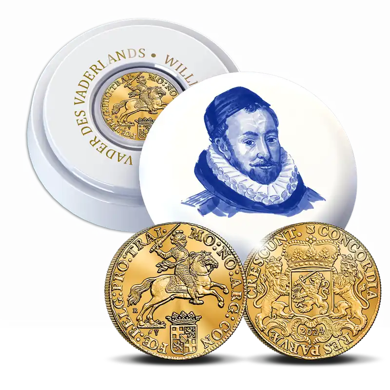 De Dukaton is een geliefde uitgifte van de Koninklijke Nederlandse Munt: de gouden editie van afgelopen jaar is volledig uitverkocht! Daarom brengen we in 2024 opnieuw een gouden herslag uit van de Dukaton, deze keer uit 1584. Deze prachtige munt is verkrijgbaar in goud en zilver: de gouden herslag is beschikbaar in zeer gelimiteerde oplage en is voorzien van een Certificaat van Echtheid. Mis hem niet!Vader des Vaderlands en de Dukaton In Nederland zijn veel muntsoorten de revue gepasseerd. Een daarvan is de Dukaton: een van origine zilveren munt die zijn oorsprong had in Italië. Ook in Spanje en later de Spaanse Nederlanden werd de munt gebruikt. Tijdens het leven van Willem van Oranje was de Dukaton ook in omloop. Zijn beeltenis en naam prijkt op de verpakking van deze herslag. Als leider in de Opstand tegen de Spanjaarden en Vader des Vaderlands is Willem van Oranje een mooi onderdeel van het verhaal van de Dukaton.De munthouder van de gouden Dukaton 2024, traditiegetrouw gemaakt door Royal Delft, tonen een handgeschilderde beeltenis van Willem van Oranje, ook wel bekend als de Vader des Vaderlands. Een uniek detail is dat Royal Delft is gevestigd in de stad waar het leven van Willem van Oranje in 1584 tot een einde kwam: Delft. Aan de binnenzijde, rondom de munt, staat in goudkleurige letters de tekst ‘Willem van Oranje • Vader des Vaderlands’. Een bijzondere gouden herslag, een schitterende, handgemaakte munthouder en een indrukwekkende geschiedenis komen allemaal samen met deze uitgifte!Specificaties Royal Delft munthouderAfmeting110 mm diameter, 40 mm hoogGewicht280 gMateriaalAardewerkOntwerpHandgeschilderd en uniek genummerdJaar van uitgifte2024