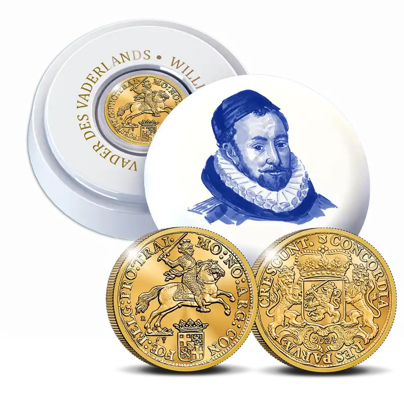 De Dukaton is een geliefde uitgifte van de Koninklijke Nederlandse Munt: de gouden editie van afgelopen jaar is volledig uitverkocht! Daarom brengen we in 2024 opnieuw een gouden herslag uit van de Dukaton, deze keer uit 1584. Deze prachtige munt is verkrijgbaar in goud en zilver: de gouden herslag is beschikbaar in zeer gelimiteerde oplage en is voorzien van een Certificaat van Echtheid. Mis hem niet!Vader des Vaderlands en de Dukaton In Nederland zijn veel muntsoorten de revue gepasseerd. Een daarvan is de Dukaton: een van origine zilveren munt die zijn oorsprong had in Italië. Ook in Spanje en later de Spaanse Nederlanden werd de munt gebruikt. Tijdens het leven van Willem van Oranje was de Dukaton ook in omloop. Zijn beeltenis en naam prijkt op de verpakking van deze herslag. Als leider in de Opstand tegen de Spanjaarden en Vader des Vaderlands is Willem van Oranje een mooi onderdeel van het verhaal van de Dukaton.De munthouder van de gouden Dukaton 2024, traditiegetrouw gemaakt door Royal Delft, tonen een handgeschilderde beeltenis van Willem van Oranje, ook wel bekend als de Vader des Vaderlands. Een uniek detail is dat Royal Delft is gevestigd in de stad waar het leven van Willem van Oranje in 1584 tot een einde kwam: Delft. Aan de binnenzijde, rondom de munt, staat in goudkleurige letters de tekst ‘Willem van Oranje • Vader des Vaderlands’. Een bijzondere gouden herslag, een schitterende, handgemaakte munthouder en een indrukwekkende geschiedenis komen allemaal samen met deze uitgifte!Specificaties Royal Delft munthouderAfmeting110 mm diameter, 40 mm hoogGewicht280 gMateriaalAardewerkOntwerpHandgeschilderd en uniek genummerdJaar van uitgifte2024