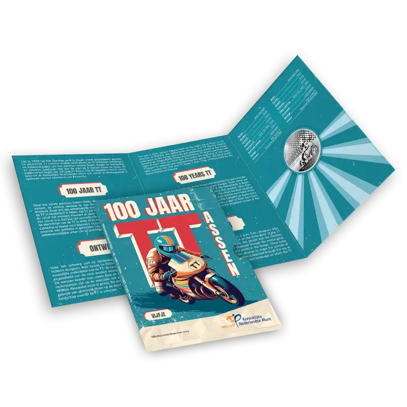 De TT Assen: het is niet alleen een sportevent, maar ook een iconisch onderdeel van de motorsportgeschiedenis. In 1925 werd de eerste race gereden op de hobbelige zandwegen tussen Rolde, Borger en Schoonloo. Nu, 100 jaar later, wordt er nog altijd geracet in Assen én lanceert de Koninklijke Nederlandse Munt, in opdracht van het Ministerie van Financiën, een unieke herdenkingsmunt: het 100 jaar TT Assen Vijfje in Zilver Proof.100 jaar TT AssenAl 100 jaar zijn Assen en racen onlosmakelijk met elkaar verbonden. De eerste race werd gereden in 1925 en sinds de start van het officiële wereldkampioenschap in 1949 staat de TT Assen onafgebroken op de agenda. Het circuit waarop wordt gereden, ook wel de Cathedral of Speed genoemd, is in 100 jaar tijd verschillende keren aangepast, maar de start/finishlijn is sinds 1926 onveranderd gebleven!Niet alleen de jaarlijkse MotoGP vindt plaats op het circuit in Assen. Het hele jaar door zijn er bijna tweehonderd evenementen: van verschillende kampioenschappen tot andere grote publieksevenementen. Gelukkig kan het circuit rekenen op 1500 vrijwilligers uit het hele land die zich met hart en ziel inzetten. Een deel van het publiek komt ook al generatieslang naar de races: sommigen bezoeken de races al meer dan 60 jaar!OntwerpHet 100 jaar TT Assen Vijfje is ontworpen door Alex Jacobs en Ellemieke Schoenmaker. Het ontwerp symboliseert drie essentiële aspecten van de TT: de race, de mensen en de locatie. De motorcoureur op de munt vertegenwoordigt de snelheid en dynamiek van de race. De rasterpunten, verwerkt op de keerzijde, verwijzen naar het publiek en de verbondenheid van de mensen met het event. De strakke lijnen verbeelden het vlakke, Drentse landschap. Op de voorzijde is voor het portret van Koning Willem-Alexander gebruik gemaakt van dezelfde rasterpunten als de keerzijde. Zo laten de ontwerpers zien dat de Koning een van de mensen is.De zilveren munt is geplaatst in een speciale drieluikverpakking, ontworpen door de Koninklijke Nederlandse Munt. Het design is gebaseerd op oude posters van de Tourist Trophy en brengt het gevoel van weleer helemaal terug. Ook is in de verpakking meer informatie te lezen over het design en de TT Assen.