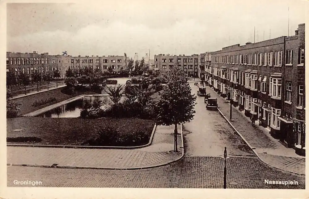 N.V. Luxe Papierwarenhandel v\\/h Roukes & Erhart. Kartelrandjes. Gelopen aansichtkaart met postzegel en stempel Groningen 1934.