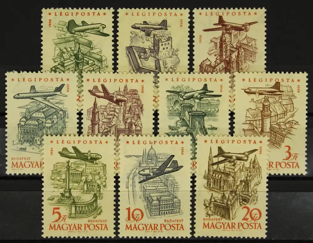 Hongarije 1958, Michel 1561-1570, Luchtpostzegels: Vliegtuigen boven bezienswaardigheden, complete serie, postfris/MNH