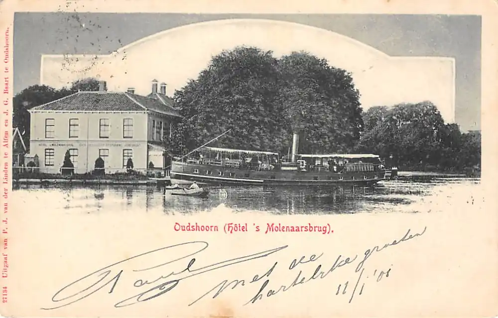 27134. Uitgaaf van P.J. van der Linden, Alfen en J.G. Baart te Oudshoorn, Gelopen ansichtkaart met postzegel en stempels 1901.