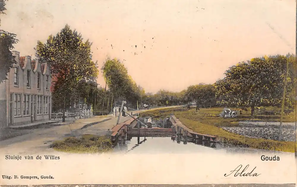 Uitg. B. Gompers, Gouda. Gelopen ansichtkaart met postzegel en stempel 1904. Bijzonder mooi ingekleurde ansichtkaart.