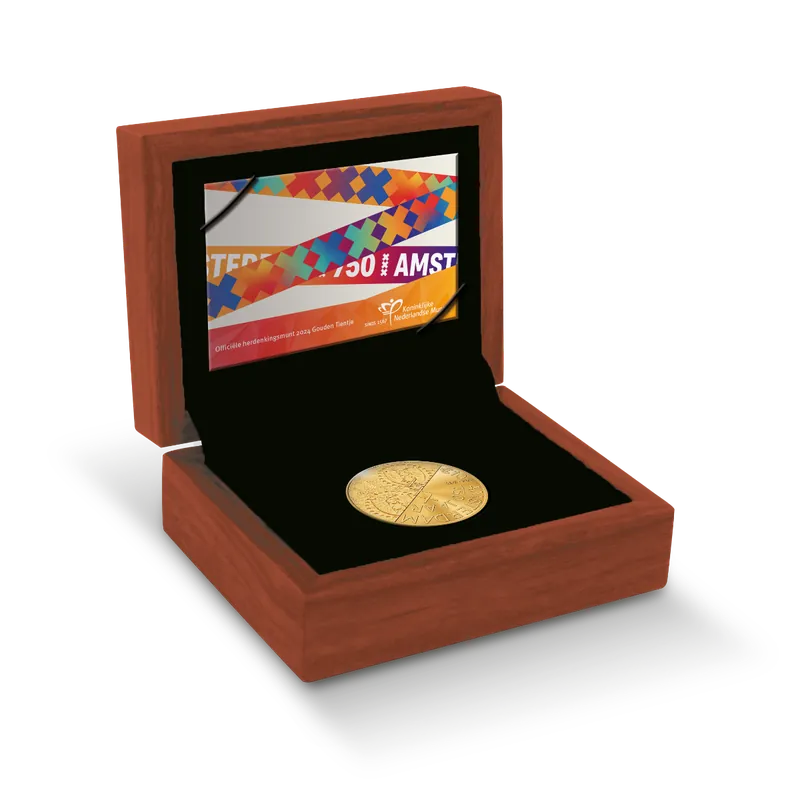 Onze hoofdstad viert feest! Vanaf 27 oktober 2024 tot 27 oktober 2025 viert Amsterdam haar verjaardag. En dat begint meteen groots, met de uitgifte van een speciale herdenkingsmunt. Slechts twee keer per jaar brengt de Koninklijke Nederlandse Munt, in opdracht van het Ministerie van Financiën, een herdenkingsmunt uit. Zoals altijd is er dit jaar ook een gouden munt.Het 750 jaar Amsterdam Gouden Tientje heeft een goudgehalte van 900/1000 en heeft daarnaast de hoogst mogelijke kwaliteit Proof. De muntstempels zijn gepolijst en krijgen daardoor een prachtig effect. Iedere gouden munt wordt met grote zorg behandeld. Het 750 jaar Amsterdam Tientje in Goud is zeer gelimiteerd verkrijgbaar: mis hem niet!750 jaar Amsterdam: van rustig dorp tot bruisende wereldstadDe eerste keer dat we de naam Amsterdam, in de uitvoering Amestelledamme tegenkomen in de geschiedenis, is op 27 oktober 1275. Het is dan nog een klein dorp aan de Amstel, maar wel met een gunstige ligging voor handel. In 1275 krijgt Amsterdam officieel het tolprivilege: dit moment wordt dan ook gezien als de geboortedatum van de stad. Vanaf 1300, wanneer Amsterdam officieel stadsrechten krijgt, begint de stad echt te groeien. Onder andere de bezetting van Antwerpen door de Spanjaarden in de 16e eeuw en de industrialisatie zorgen ervoor dat Amsterdam uitgroeit tot de wereldstad die het vandaag is. Het jubileumjaar Amsterdam 750 wordt in 2024 en 2025 groots gevierd met tal van evenementen en initiatieven in en rondom Amsterdam. Verleden, toekomst en verbinding zijn de drie belangrijkste pijlers van het jubileum. Met de herdenkingsmunt onderstrepen we deze pijlers en is er voor altijd een schitterend aandenken aan 750 jaar Amsterdam.OntwerpHet 750 jaar Amsterdam Gouden Tientje is ontworpen door kunstenaar Hans Gremmen. De wisselwerking tussen toen en nu is goed zichtbaar, zowel op de voor- als de keerzijde van de munt. Op de voorzijde staat het portret van Koning Willem-Alexander. Hij is zo getekend door de kunstenaar dat zijn portret dezelfde stijl krijgt als die van voorgaande Nederlandse vorsten. De keerzijde van de munt bestaat uit twee helften. Op de ene helft staat een afbeelding van een oude merkentang uit 1350 met daarop het Amsterdamse stadswapen. Dit is naar verluid de eerste keer dat het stadswapen werd gebruikt. Deze helft van de munt heeft een matte finish. De andere helft bestaat uit hedendaagse typografie, waarmee de tekst ‘750 jaar Amsterdam’ en de jaartallen 1275 – 2025 zijn geschreven. Deze helft heeft een meer glanzende finish. Beide helften komen samen door de plaatsing van drie kruizen uit het Amsterdamse stadswapen in het midden van de keerzijde.