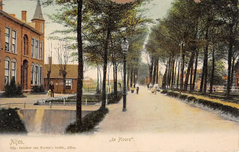 Typ. Cambier Van Nooten’s boekh. Alfen. Gelopen ansichtkaart uit begin 1900; in 1916 verzonden met postzegel en stempel. Bovenrand Oppervlakkige slijtplekjes; zie de scans.