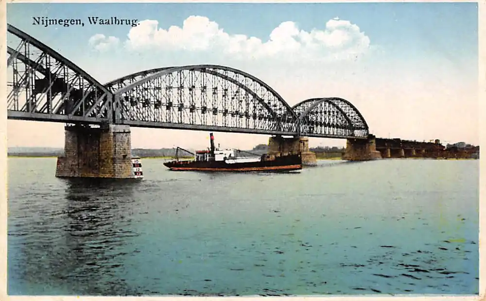 Rabat Nijmegen Waalbrug met binnenvaart schip Scheepvaart 1938 HC48178
