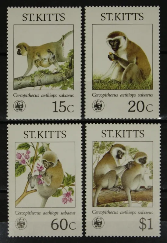 St. Christophe – St. Kitts 1986, Michel 184-187, Natuurbescherming (WNF): Apen (Meerkatten), complete postfrisse serie / MNH