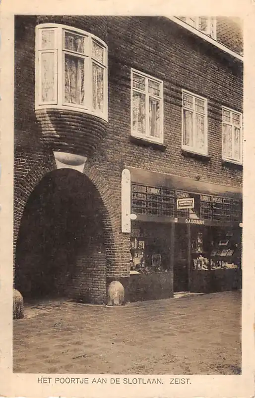 D.A. Bouman, Boekhandel Slotlaan b. Zeist. Gelopen ansichtkaart met stempel jaren 20; postzegel verwijderd; zie de scans.