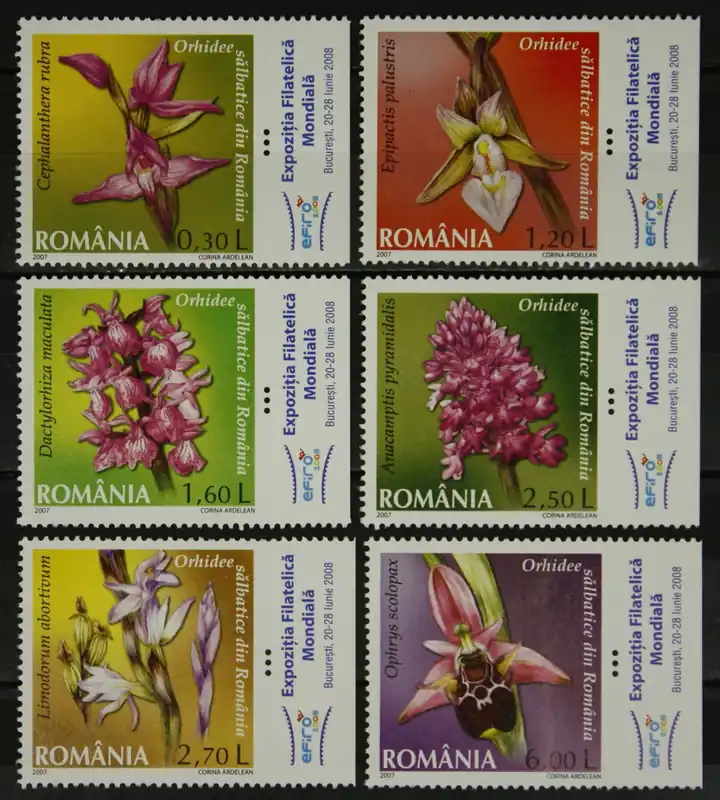 Roemenië 2007, Michel 6174-6179 D (rechts 3-gaats getand), met zierveld.Int. Postzegeltentoonstelling EFIRO 2008: Wilde orchideeën, complete postfrisse serie / MNH