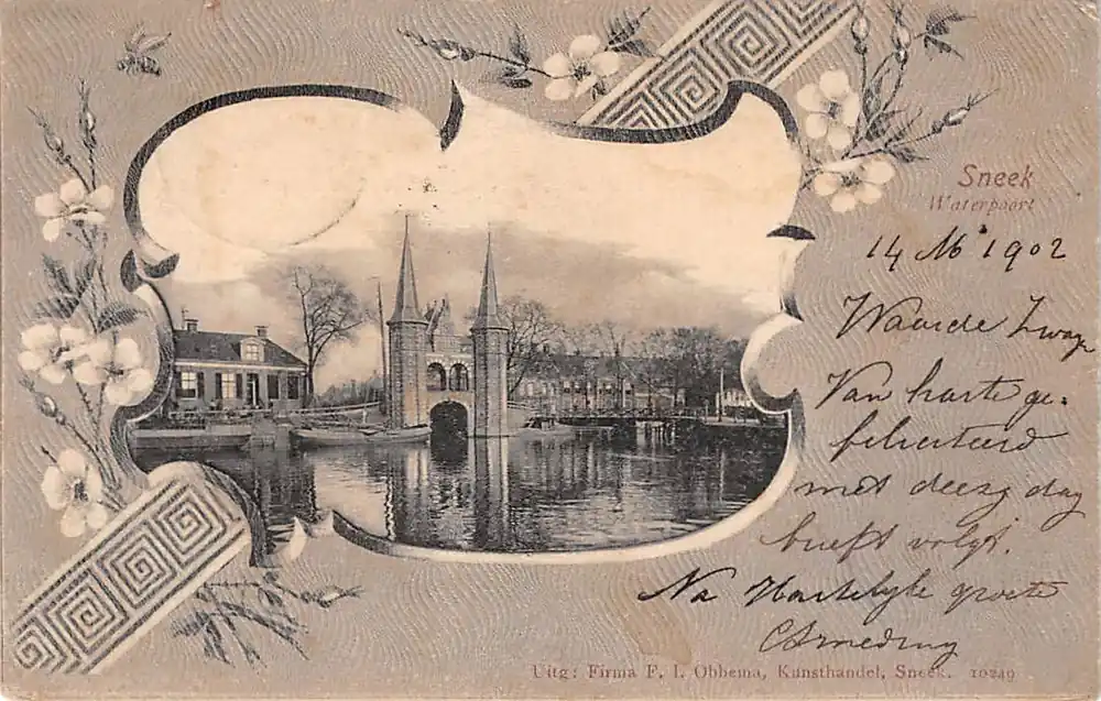 Uitg. Firma F.I. Obbema, Sneek. 10249. Gelopen ansichtkaart met stempels 1902. Postzegel netjes verwijderd. Achterzijde wat gevlekt.