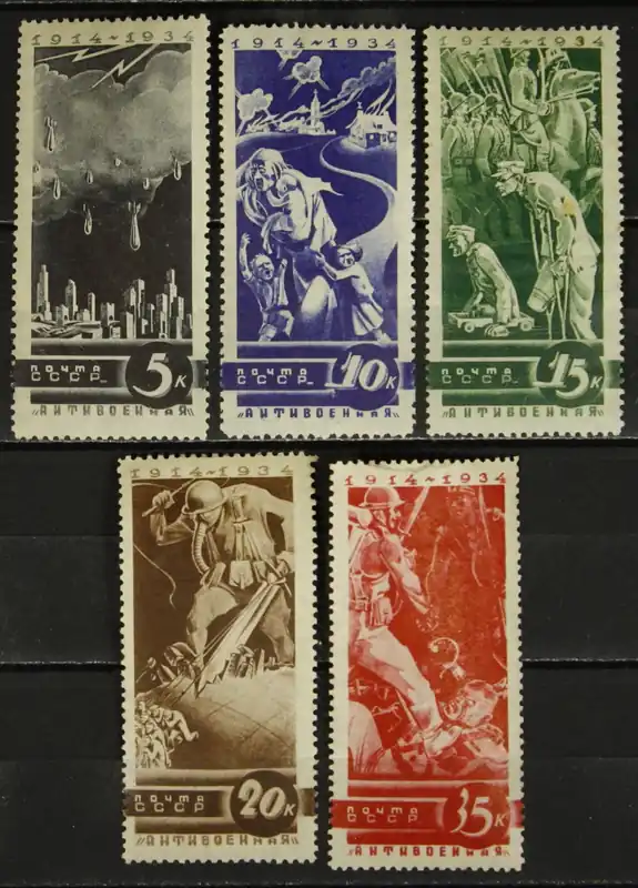 Sovjet-Unie 1935, Michel 494-498, Herinnering uitbraak Eerste Wereldoorlog, complete ongebruikte serie, plakkerspoor / MHFraaie exemplaren: 1 zegel heeft roestpuntje, 2 zegels wat albumzwart op gomCat. waarde € 850,00. Schaarse serie, laag geprijsd!