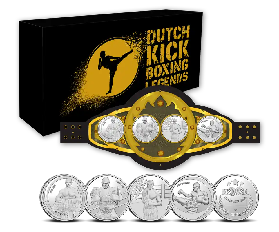 31 mei 1976: een uniek moment in de Nederlandse sportgeschiedenis. Het allereerste, officiële kickboksgevecht in Nederland vindt plaats. Iets daarvoor heeft karateka Jan Plas een reis naar Japan gemaakt, waar hij kennismaakt met deze vechtsport. Geïnspireerd door wat hij hier ziet, is hij voornemens de sport ook in Nederland groot te maken. En met succes, want bijna 50 jaar later is kickboksen populairder dan ooit. Om de grote helden van het kickboksen te eren, in combinatie met het eerste grote GLORY toernooi in 10 jaar tijd, lanceert de Koninklijke Nederlandse Munt een wel heel speciale set!Terug naar het begin: na die bewuste avond in 1976 zit kickboksen in Nederland in de lift. En in de jaren die volgen staan verschillende grote namen op. Toch hangt er soms een zweem van grimmigheid rondom het kickboksen in de jaren tachtig en negentig, waardoor de sport niet altijd aan positiviteit wordt gelinkt. Tegelijkertijd kent de sport in de jaren 90 ook een enorme bloeiperiode, waarin grote namen als Ernesto Hoost, Peter Aerts, Remy Bonjasky en Semmy Schilt Nederland internationaal echt op de kaart zetten.Speciale set voor Nederlandse kickboksheldenHet kickboksen is door de decennia heen enorm gegroeid, mede dankzij de grote namen die de sport het impuls hebben gegeven die het nodig had. De Koninklijke Nederlandse Munt vindt dat deze mannen het eerbetoon moeten krijgen die ze verdienen. Daarom verschijnt een speciale set die hen in het zonnetje zet:Semmy Schilt – viervoudig winnaar van de K-1, een van de meest succesvolle zwaargewicht kickboksers aller tijden.Ernesto Hoost – viervoudig winnaar van de K-1, staat bekend om zijn goede techniek.Peter Aerts – drievoudig winnaar van de K-1, vocht als enigste mee in alle K-1 toernooien vanaf de eerste in 1993 tot de laatste in 2010 en heeft daardoor de bijnaam Mister K-1Remy Bonjasky – drievoudig winnaar van de K-1, won bij zijn debuut in 2003, tijdens de finale in Tokio.GLORYGLORY is een internationale, prestigieuze kickboksorganisatie, opgericht in 2012. GLORY organiseert gevechtsevenementen van wereldklasse en bereikt daarmee miljoenen fans over de hele wereld. Enkele grote namen staan bij GLORY onder contract of hebben hier onder contract gestaan tijdens hun carrière, waaronder de vier kickboksers die in de speciale set worden geëerd. In maart 2024 organiseert GLORY voor het eerst in 10 jaar een nieuw toernooi in de Gelredome in Arnhem, waarbij grote vechters ten tonele verschijnen en het tegen elkaar opnemen.Speciale sets én 14 vergulde sets De speciale set bestaat uit vier penningen: iedere icoon krijgt zijn eigen penning. Deze penningen zijn geplaatst in een zeer toepasselijke verpakking, welke de vorm heeft van een kampioenschapsriem die winnaars van een bokswedstrijd of -toernooi ontvangen. Er zijn 500 speciale sets verkrijgbaar, maar er komen daarnaast ook 14 vergulde sets. Er is voor 14 sets gekozen, omdat de legendes bij elkaar 14 overwinningen hebben gehaald.