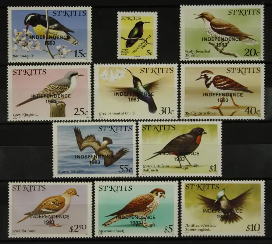 St. Christopher – St. Kitts 1983, Onafhankelijkheid, Vogels, complete postfrisse serie met opdruk “Independence 1983” / MNH