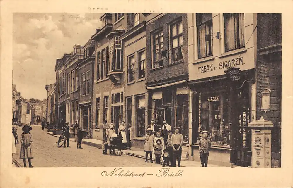 Szybka dostawa Brielle Nobelstraat met winkel tabak en sigaren A. Aden en PTT brievenbus 1923 HC61516