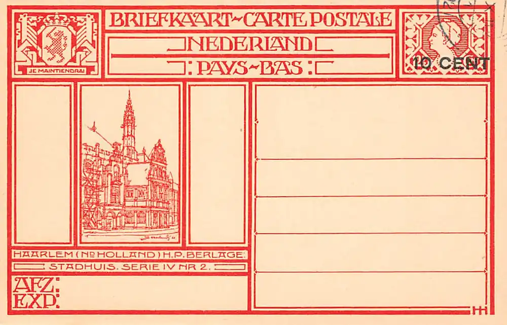 H.P. Berlage Serie IV Nr. 2. Afbeelding op briefkaart met 10 cents opdruk op 12,5 cent en met dagstempel 13 – X – 11 1927. Kleinformaat.