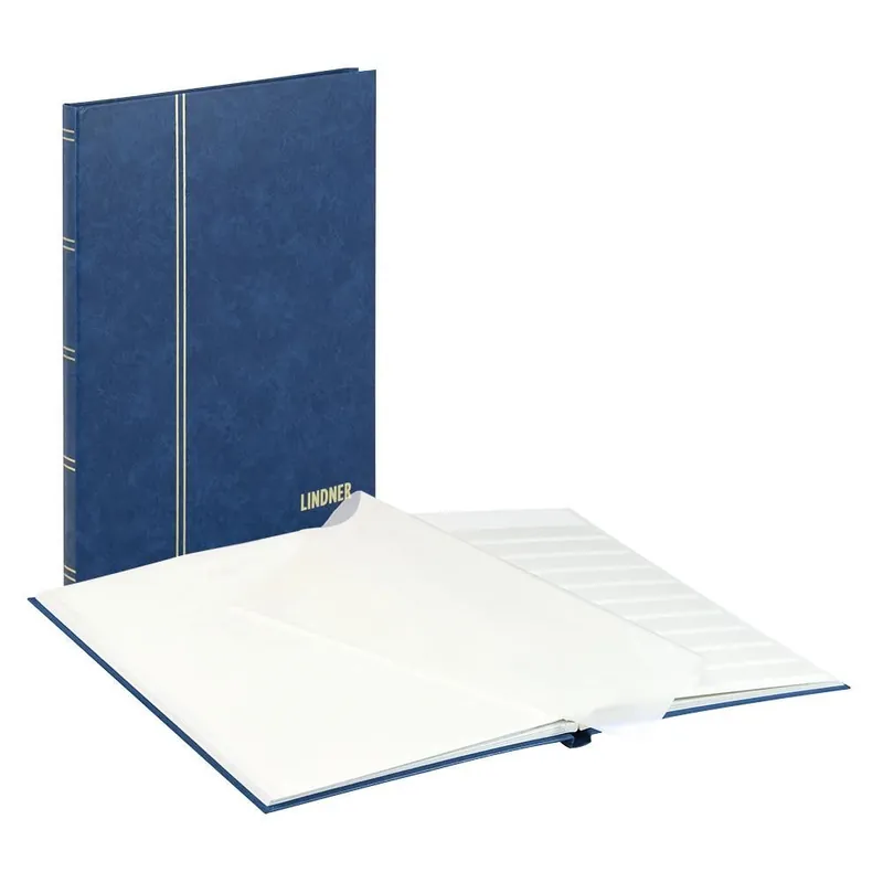 Lindner 1160 insteekboek groot formaat, 16 witte blz (kaftkleur blauw)- formaat 23 x 30,5 cm- 8 witte bladen = 16 blz.- 10 doorlopende pergamijn foliestroken per blad- met pergamijn tussenbladen- ongewatteerde lederlook kaft met goudopdruk op rug en voorzijde- Duits kwaliteitsprodukt