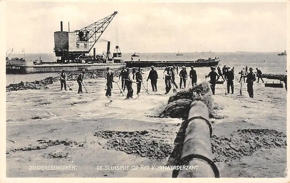 Szybka dostawa Kornwerderzand Zuiderzee werken De Sluisput De Uitmonding van de persbuis waardoor het zand wordt opgeperst, van achteren gezien IJsselmeer Harlingen HC20080