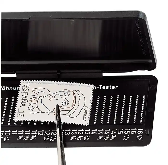 Lindner Phila-Combi-Box tandingmeterDit precisieapparaat geeft een exacte beoordeling van elke voorkomende maat postzegeltanding.Het deksel kan worden gebruikt als watermerkzoeker, met behulp van speciale vloeistof.