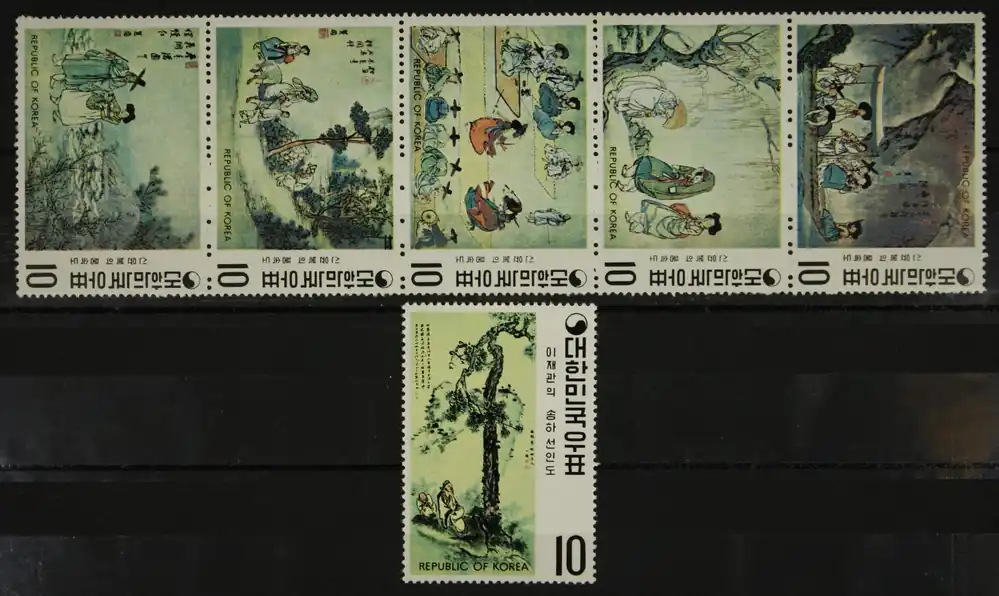 Zuid-Korea 1971, Michel 793-798, Schilderijen van de Yi-dynastie (II), postfrisse strook met zegel / MNH
