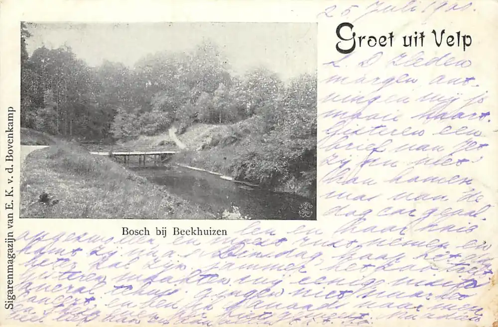 Sigarenmagazijn van E.K. v.d. Bovenkamp. Gelopen ansichtkaart van voor 1900 met postzegel en stempels 1900. Onderhoekje rechts iets gebruikt.